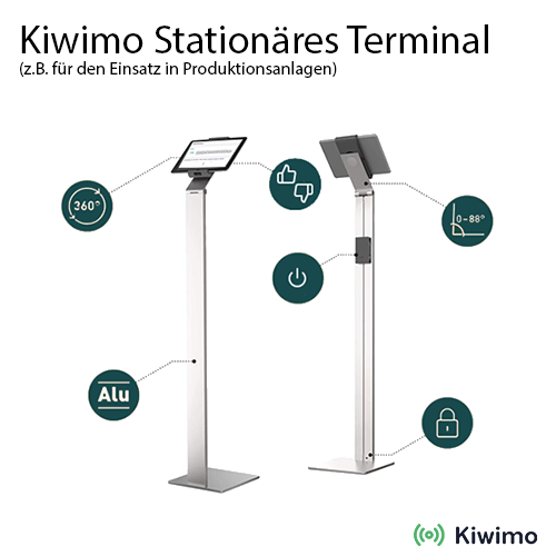 | Lieferumfang | Terminal (Tablet), Ladekabel, Netzstecker, Bedienungsanleitung (Online), Kiwimo Quick-Start Guide | Terminal (Tablet), Aluminiumständer (vormontiert), Ladekabel, Netzstecker, USB Verlängerung, Bedienungsanleitung (Online), Kiwimo Quick-Start Guide |
